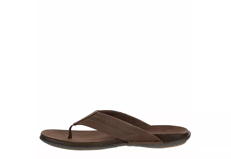 Sink into sunny day bliss with the Franco Fortini Newport men’s flip flop sandal. Featuring a leather upper with a contoured footbed to cradle your foot, this thong sandal is make for backyard BBQs or beach vacays. The perforations on the straps help breathability while the outsole is durable with some traction.