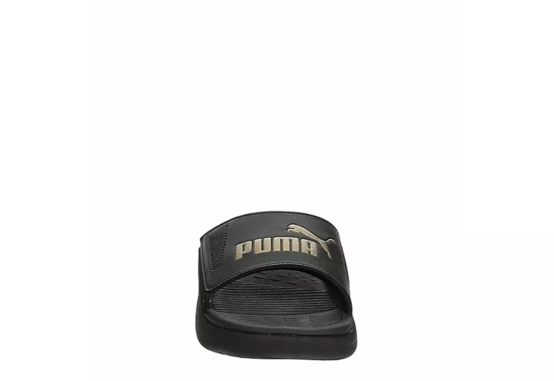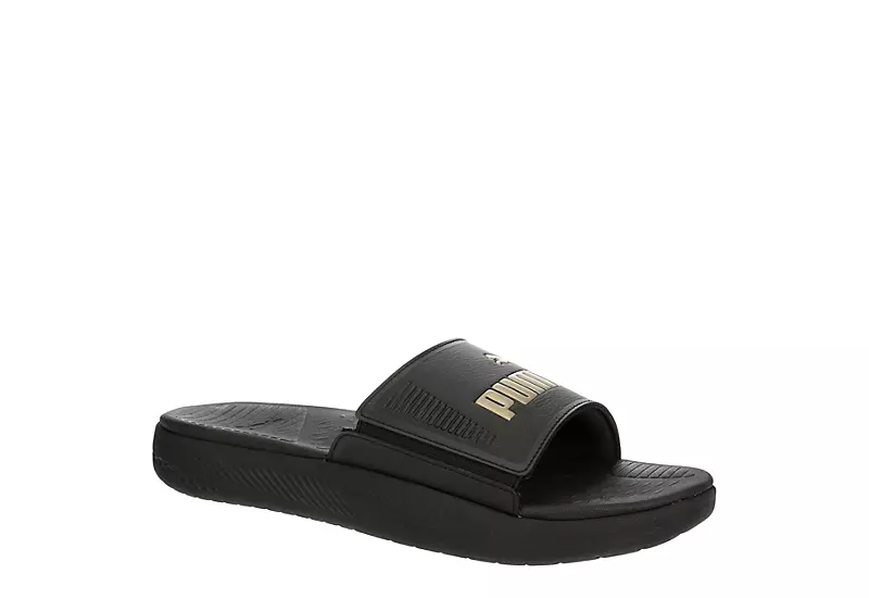 Looking cool and feeling cool are one-in-the-same in the PUMA Softride men’s slide sandal. With a faux leather upper featuring soft padding for comfort, this slide has the PUMA Wordmark and cat logo. The SOFTRIDE footbed cushions every step, making them great for the beach or a barbecue.